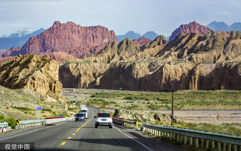 This photo shows cars driving on the Dushanzi-Kuqa highway, one of the China's most scenic roads, in the Xinjiang Uygur autonomous region, Sept 18, 2019. [Photo/VCG]