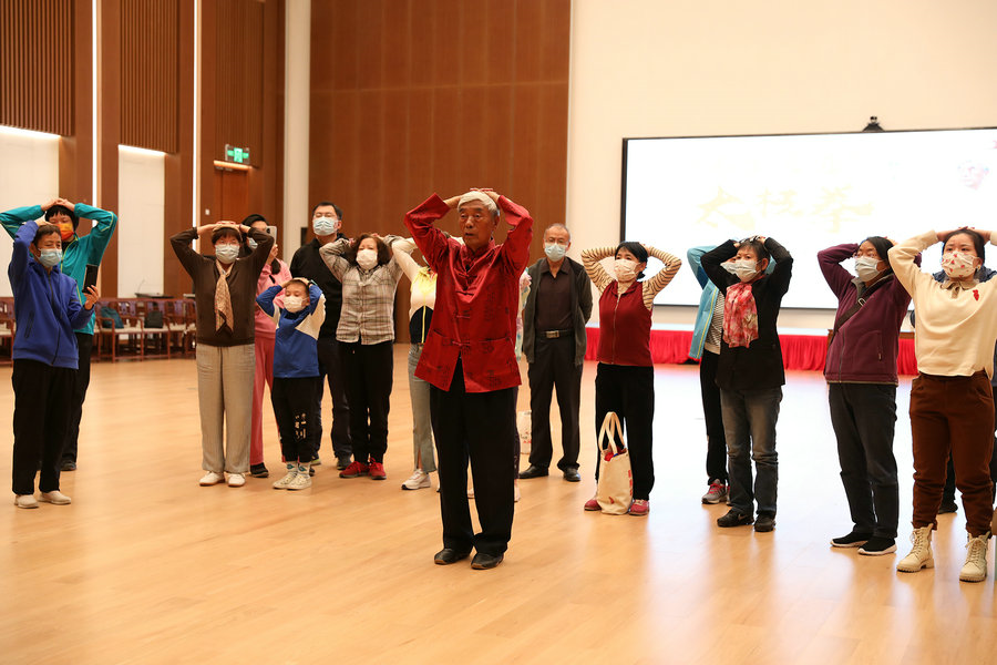 Zhang Quanling, a prestigious practitioner of tai chi fist, gives a lecture on how the soft moves benefit seniors' well-being. [Photo provided to China Daily]