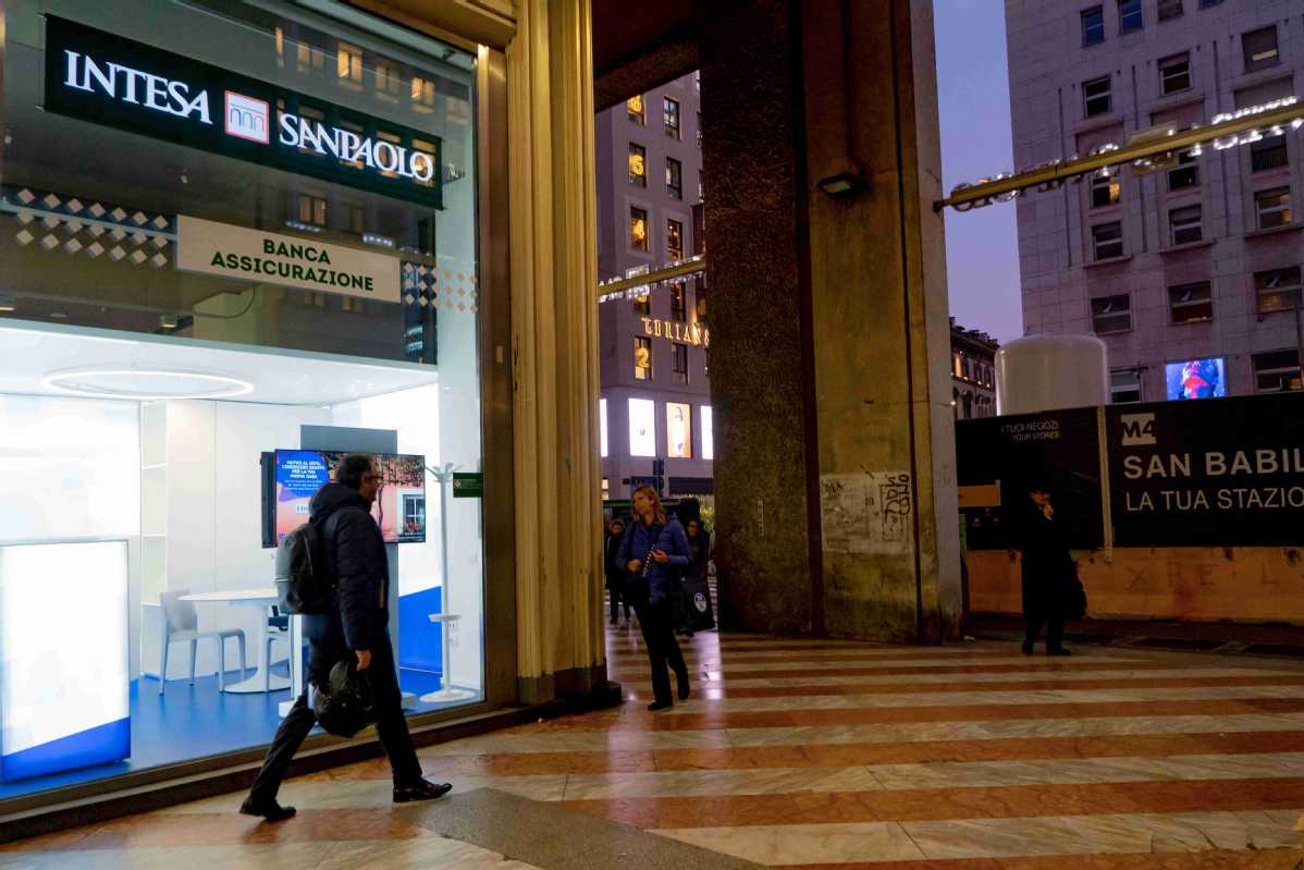 Pedestrians pass an Intesa Sanpaolo branch in Milan, Italy. The Italian banking group has applied to set up a foreign-controlled securities firm in China. [PHOTO by CALOGERO RUSSO/AGENCIES]