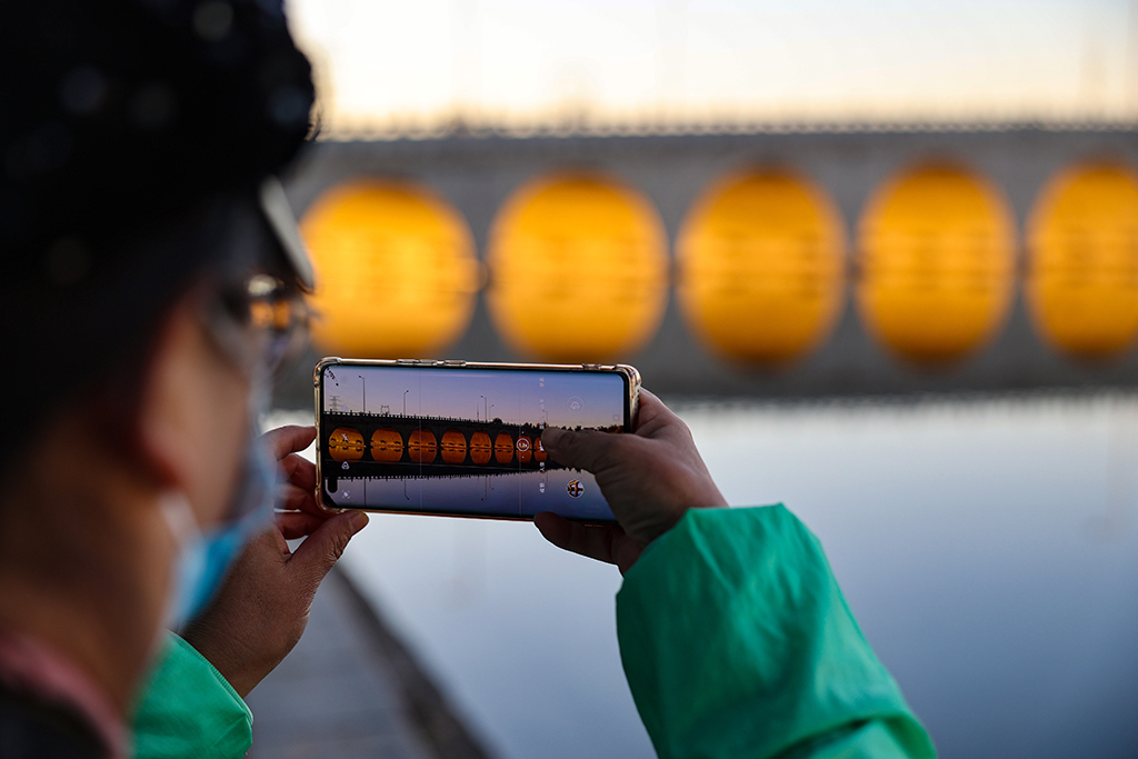 The setting sun shining through the Qianjin Bridge draws photographers to Shijiazhuang, Hebei province. [Photo/IC]