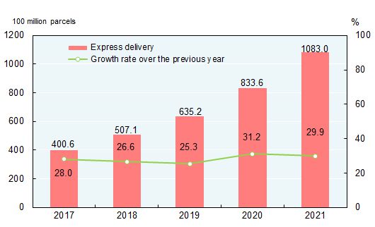 The turnover of post services totaled 1,369.8 billion yuan, up by 25.1 percent over the previous year. In 2021, the number of mail delivery was 1.09 billion; that of parcel delivery was 20 million; and that of express delivery was 108.30 billion with a revenue reaching 1,033.2 billion yuan.