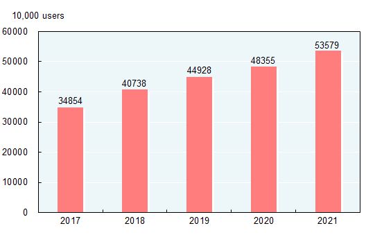 The coverage of internet was 73.0 percent, and 57.6 percent in rural areas. The mobile internet traffic in 2021 was 221.6 billion gigabytes, up by 33.9 percent over the previous year. Software revenue of software and information technology services industry in 2021 was 9,499.4 billion yuan, up by 17.7 percent over 2020 on a comparable basis.