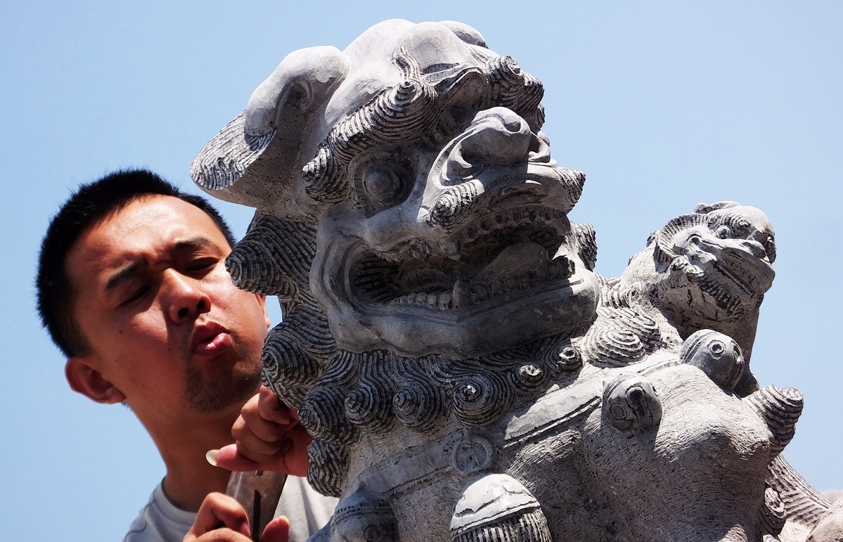 A craftsman carves a stone lion in Xizhuang village. [Photo by Gao Xinsheng/For chinadaily.com.cn]