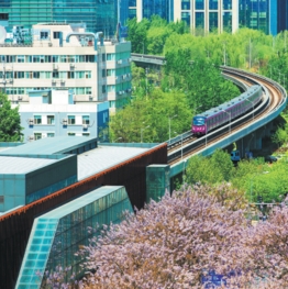 A train runs through Beijing E-Town, which features a wealth of plant life. CHINA DAILY