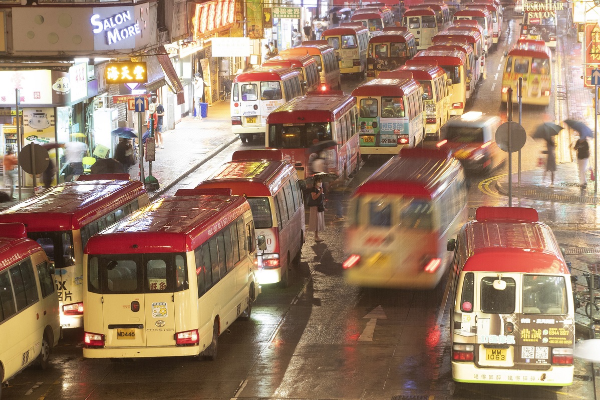 Minibuses line up at a terminus in Mongkok, Hong Kong, to pick up passengers on June 14. [Photo by ZOU HONG/chinadaily.com.cn]