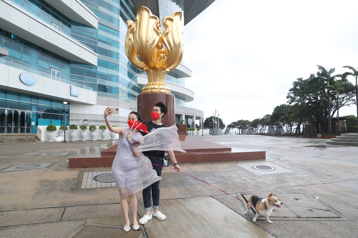 Huang Ziying, 25, and her boyfriend, both from the Chinese mainland, pose for a photo in Hong Kong's Golden Bauhinia Square on July 1. They both majored in finance and decided to stay in the city after graduation, hoping to find more opportunities in the Guangdong-Hong Kong-Macao Greater Bay Area. [Photo by ZOU HONG/chinadaily.com.cn]