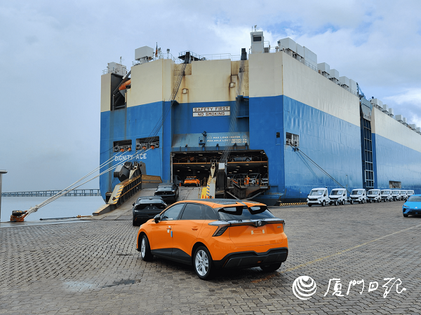 A batch of 904 SAIC Motor's new electric vehicles (EVs) departed from Xiamen Modern Terminal in Xiamen, Fujian province and headed to Europe on Aug 4, marking Xiamen port's first time to export EVs to Europe.