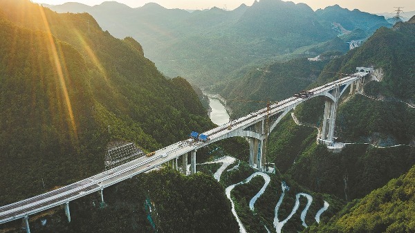 Construction was completed on a high-profile bridge in Guizhou on Monday, which when open will reduce travel time in the province and promote local economic development.