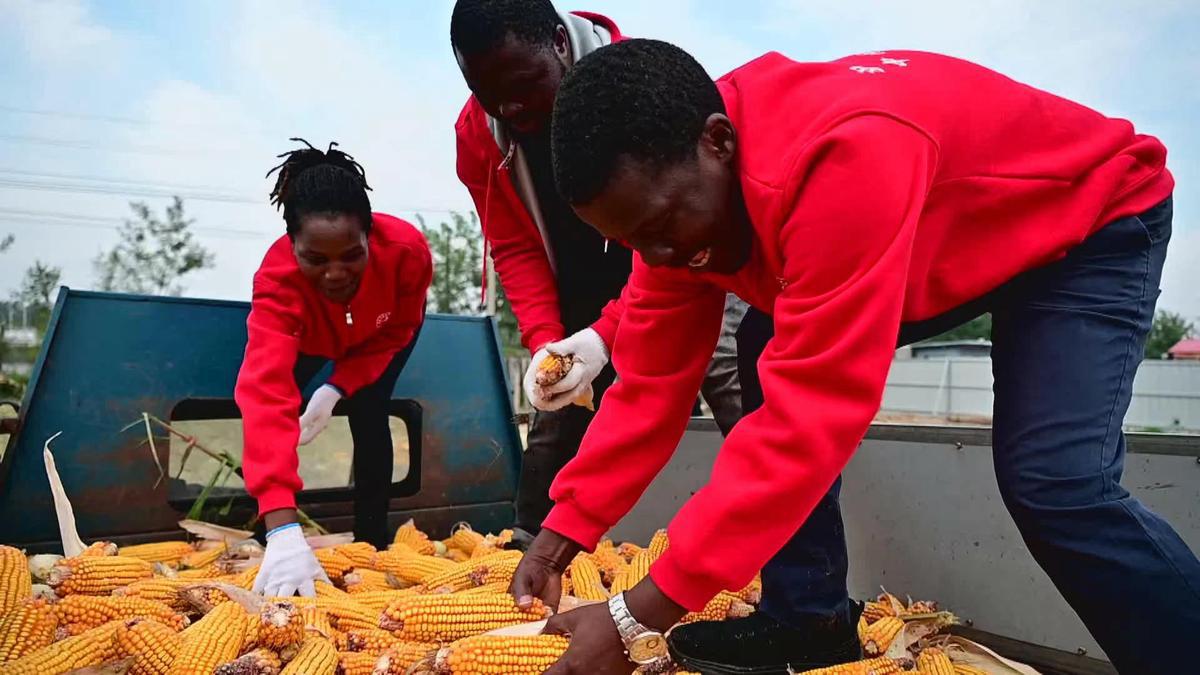 Samson, a student from Malawi, in southeastern Africa, took part in agricultural practice activities on Thursday at an experimental base in Quzhou county of Handan, Hebei province, with other three students from Beijing's China Agricultural University.