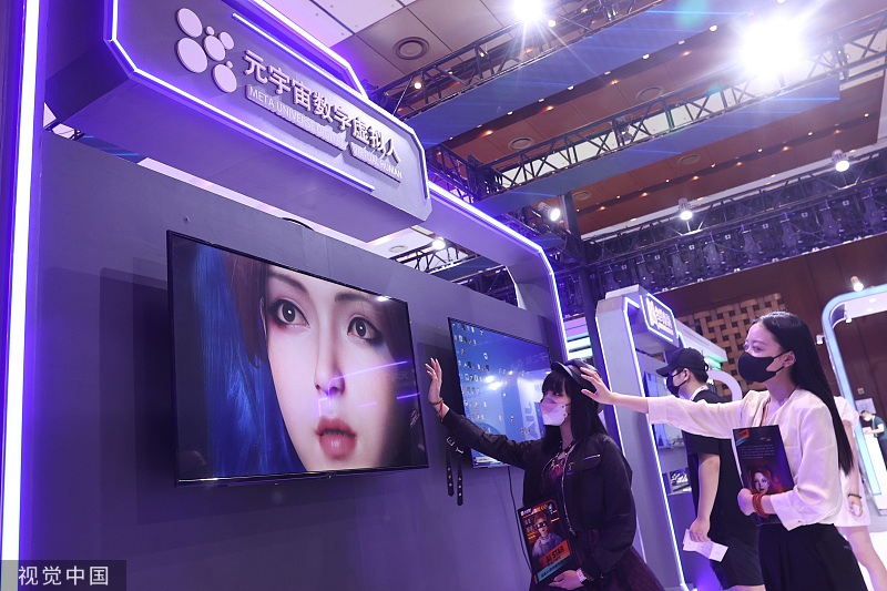 Staff members look at a core computing hardware used for artificial intelligence models at a stand of the 2022 Global Digital Economy Conference in Beijing, July 28, 2022. [Photo/VCG]