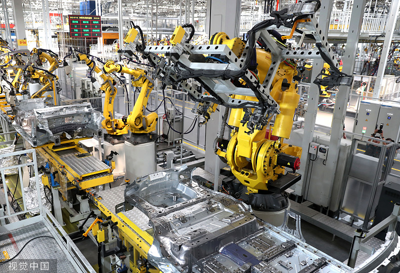 An industrial robot works at an automatic production line in Rizhao, East China's Shandong province, on July 1, 2022. [Photo/VCG]