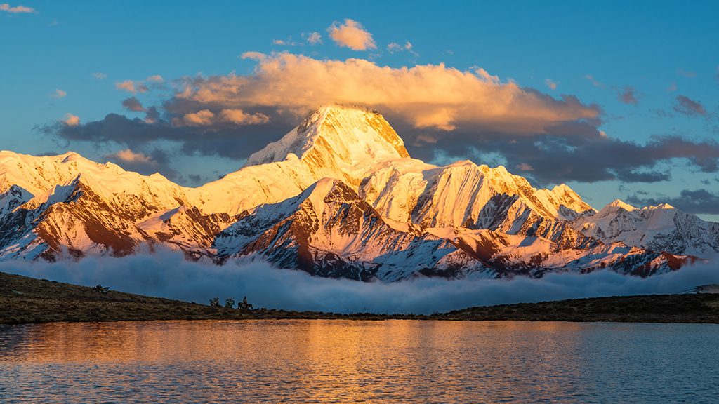 With an altitude of 7,556 meters, Mount Gongga is the highest mountain in Southwest China’s Sichuan province. In late autumn, the snow-capped mountain showcases a magnificent view, resembling a golden palace in the sun.