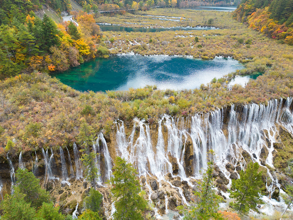 The Nuorilang Waterfall in the Jiuzhai Valley in Sichuan province flows straight down from the colorful forest in autumn. [Photo/IC]