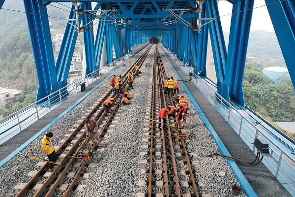 Workers from China Railway Chengdu Bureau Group Co Ltd make fine adjustments to rail tracks at the Mingyuexia Yangtze River Bridge, an important part of the east ring railroad of Chongqing on Oct 22, 2022. [Photo by Su Zhigang/Provided to chinadaily.com.cn]