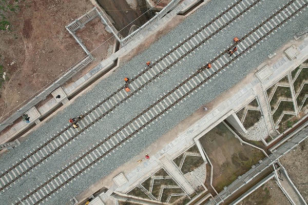 Workers from China Railway Chengdu Bureau Group Co Ltd make fine adjustments to rail tracks at the Mingyuexia Yangtze River Bridge in southwestern Chongqing on Oct 22, 2022. The east ring railroad is 158.653 kilometers long, with 8 stations and a design speed of maximum 160 kilometers per hour. [Photo by Su Zhigang/Provided to chinadaily.com.cn]