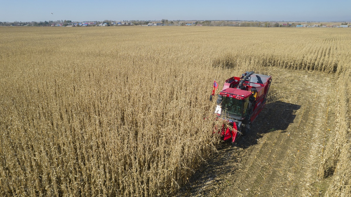 An unmanned machine harvests corn on a demonstration farm in Gongzhuling city of Changchun, Jilin province. [Photo provided to chinadaily.com.cn]