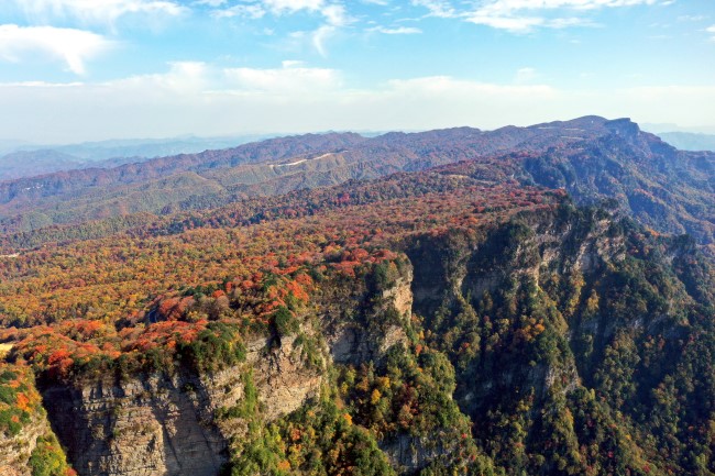 Colorful leaves in autumn decorate the Yanjing River Grand Canyon Forest Park in Wangcang county, Guangyuan, Sichuan province, attracting tourists in droves to enjoy the picturesque landscape.