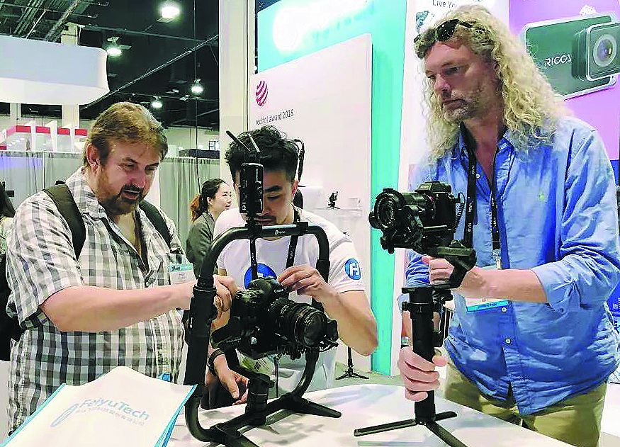 People check out digital equipment at a Feiyu Technology stand during the National Radio and Television Equipment Exhibition in Las Vegas, the United States, in April 2019. CHINA DAILY