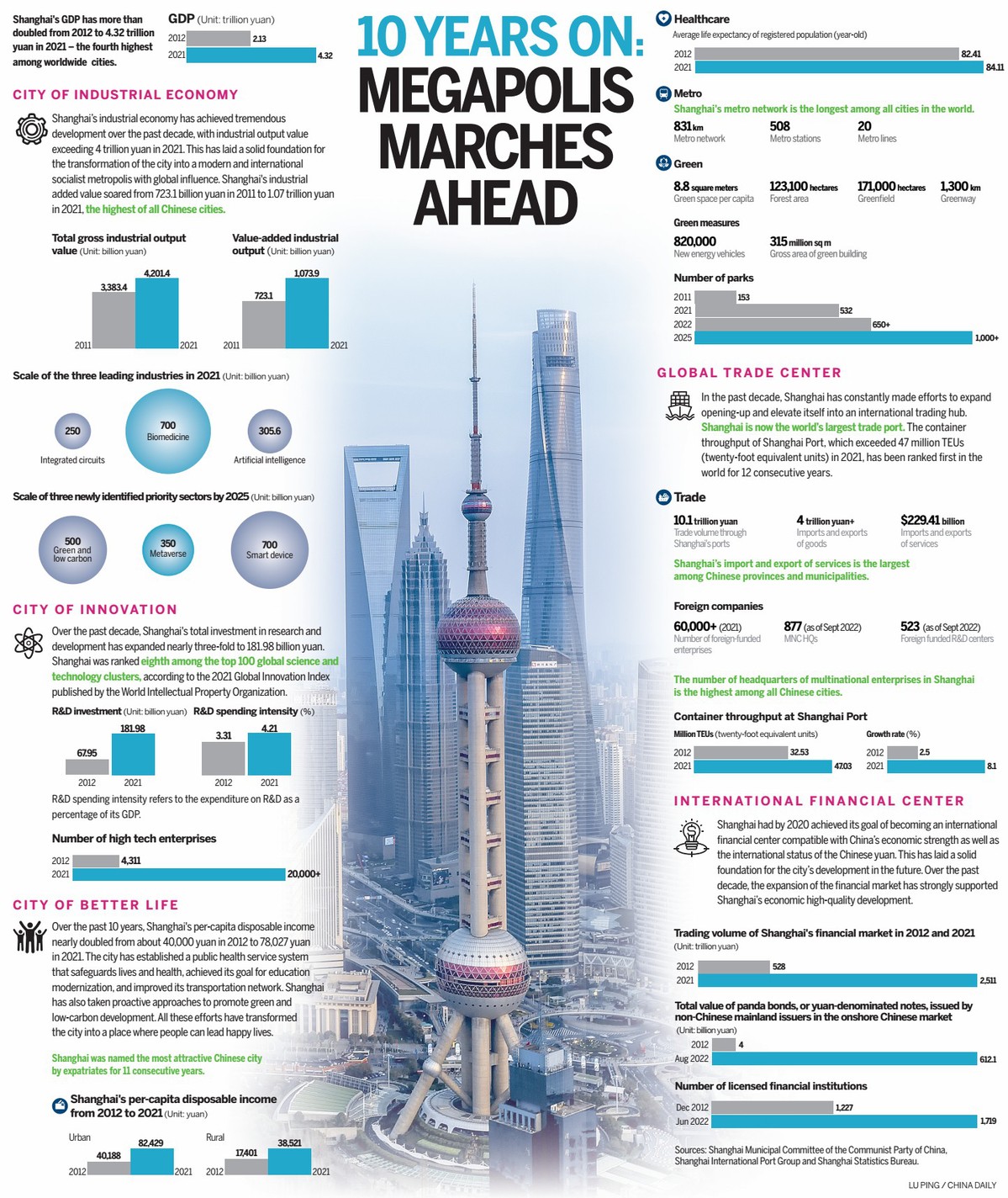 Shanghai has achieved high-quality development in its industrial economy in the past decade, with the city's total industrial output exceeding 4 trillion yuan in 2021, said Wu Jincheng, director of the Shanghai Municipal Commission of Economy and Informatization. That has created a solid foundation for transforming the city into a modern and international socialist metropolis with global influence, Wu said.