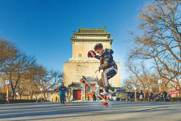 The area near the Bell Tower provides a space for people to enjoy the historical location in various ways. Board games and skateboarding are just some of the activities that take place in the cultural hot spot. [Photo by Zhu Yunxia/China Daily]