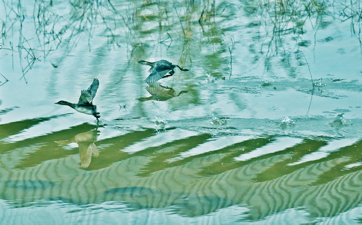 A photo shows two birds flying over a river in Yichang, Hubei province. [Photo by Liu Shusong/Provided to chinadaily.com.cn]