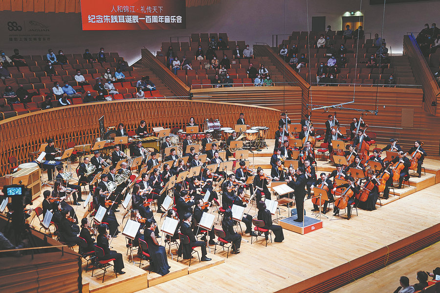 The Shanghai Symphony Orchestra performs a concert under the baton of conductor Zhang Lu, featuring music pieces by composer Zhu Jianer, to mark the 100th anniversary of Zhu's birth. [Photo provided to China Daily]
