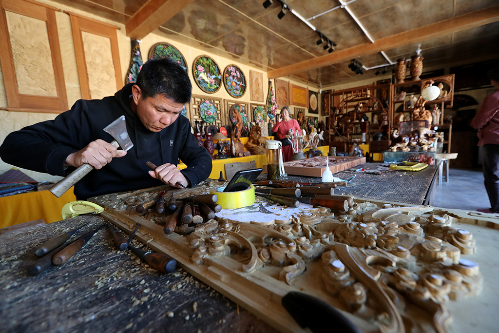A man makes wood carvings in Jianchuan wood carving art town in Yunnan province. [Photo/IC]