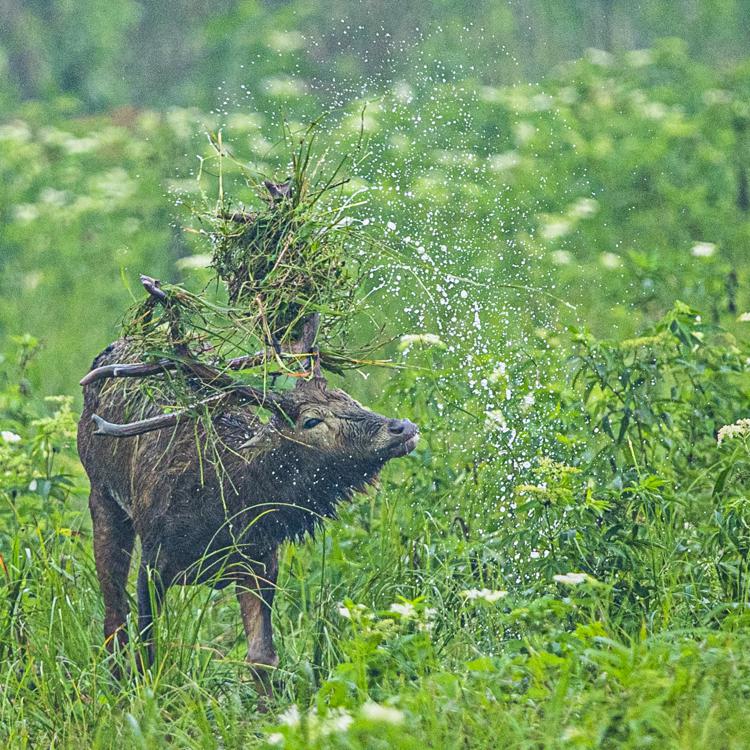 A milu plays in the water at a national nature reserve in Shishou, Hubei province, in late October. [Photo by Lei Gang/ for chinadaily.com.cn]