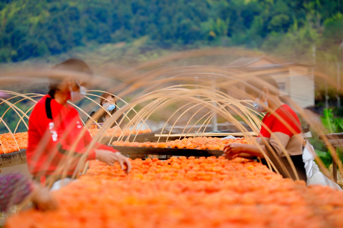 Farmers place persimmons on drying racks in the Yongding district of Longyan, Fujian province. [Photo by Huang Qiuping/For chinadaily.com.cn]