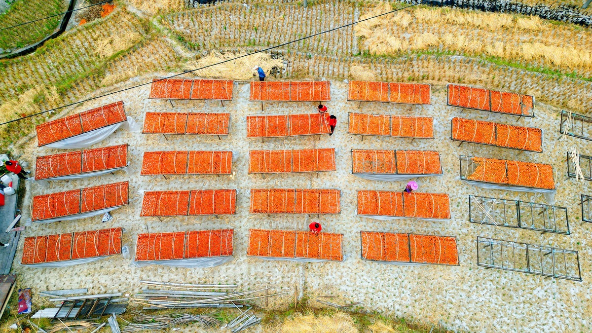 Farmers place persimmons on drying racks in the Yongding district of Longyan, Fujian province. [Photo by Wu Yuliang/For chinadaily.com.cn]