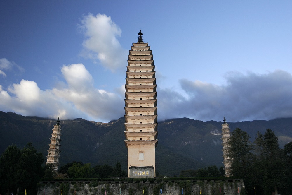 The smaller pagodas next to it were completed from 1108 to 1172, the period of the rule of the Dali Kingdom. Designed in pyramid-like shapes, each of them has 10 stories with an octagonal plan and stands at a height of 42.19 meters. Decorative bracket sets, terraces, niches and Buddhist relief carvings of varied kinds adorn each floor of the two pagodas.