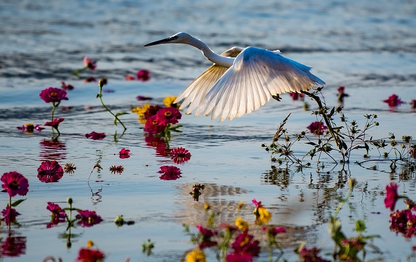 A large flock of egrets was seen gathering in a sea of flowers, skimming the water and chasing one another. The beautiful and harmonious natural scene has attracted many tourists and photographers.