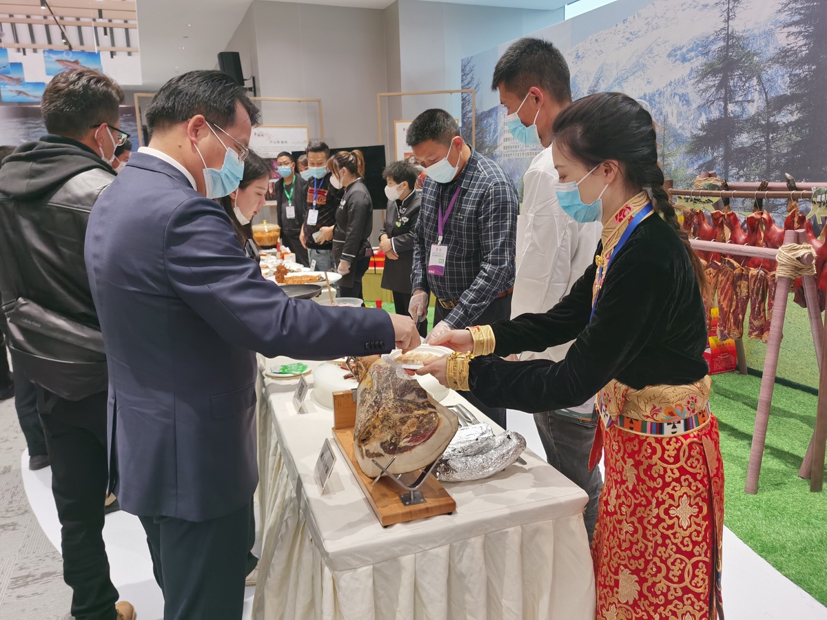 Visitors to the fifth World Sichuan Cuisine Conference held in Ya'an, Sichuan province, taste local Tibetan bacon. [Photo by Liu Yong/For chinadaily.com.cn]