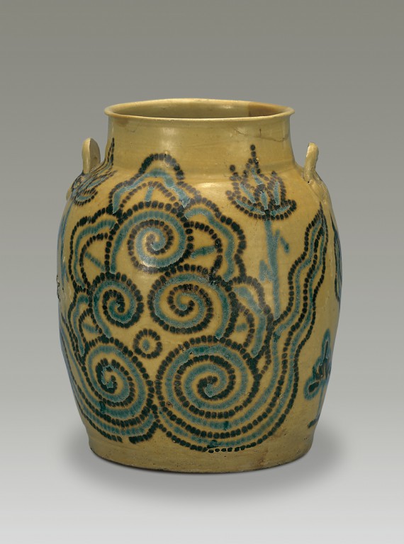 This greenish-yellow glazed jar with two handles boasts curling cloud and lotus patterns made up of brown and green dots. Its size, exquisite patterns and glaze make it a precious treasure.