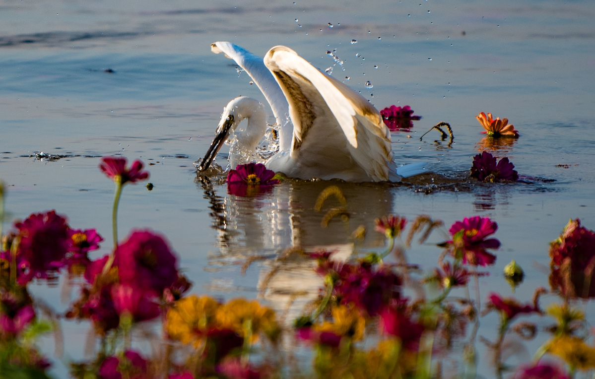 An egret swims in a flooded water-level fluctuation zone in Hongshaqi Waterfront Ecological Park, Southwest China's Chongqing. [Photo by Hou Benyan/For chinadaily.com.cn]