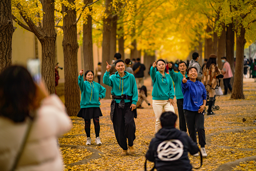 Visitors take photos of golden ginkgo leaves near the Diaoyutai State Guesthouse in Beijing. [Photo/IC]
