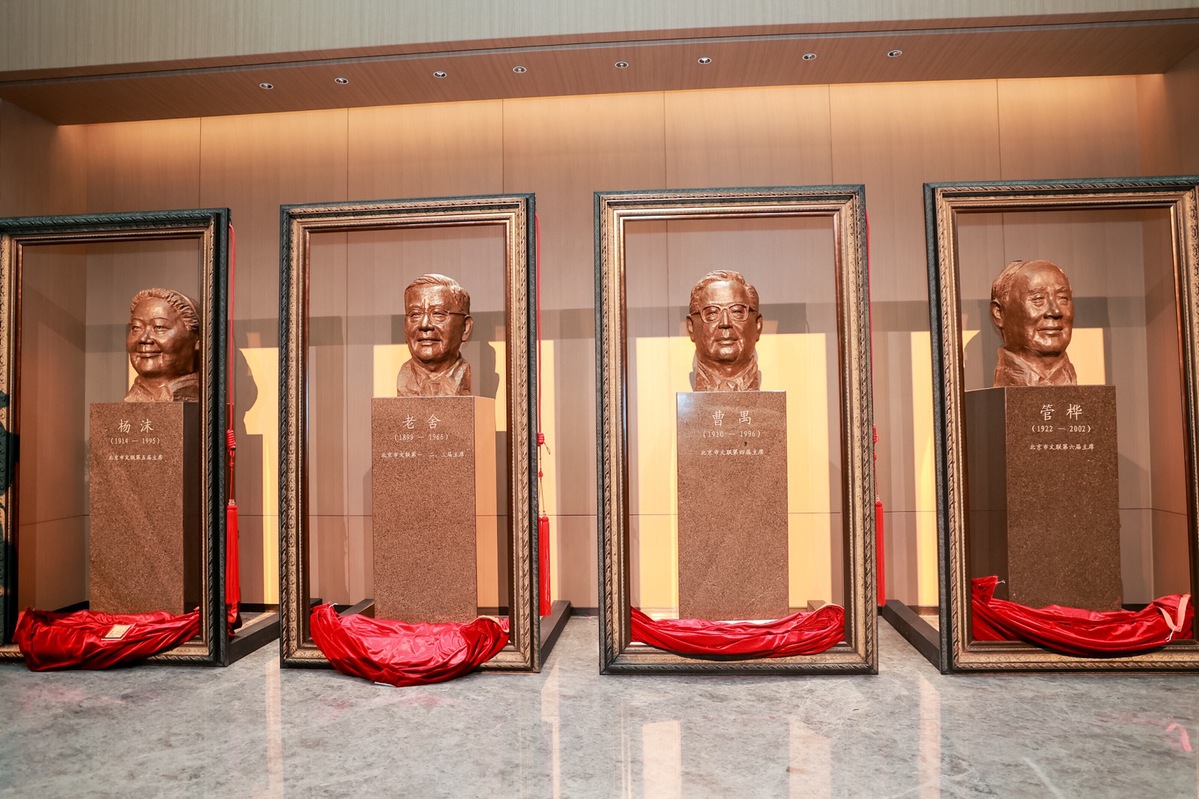 Four statues of four former presidents of Beijing Federation of Literary & Art Circles. [Photo provided to China Daily]