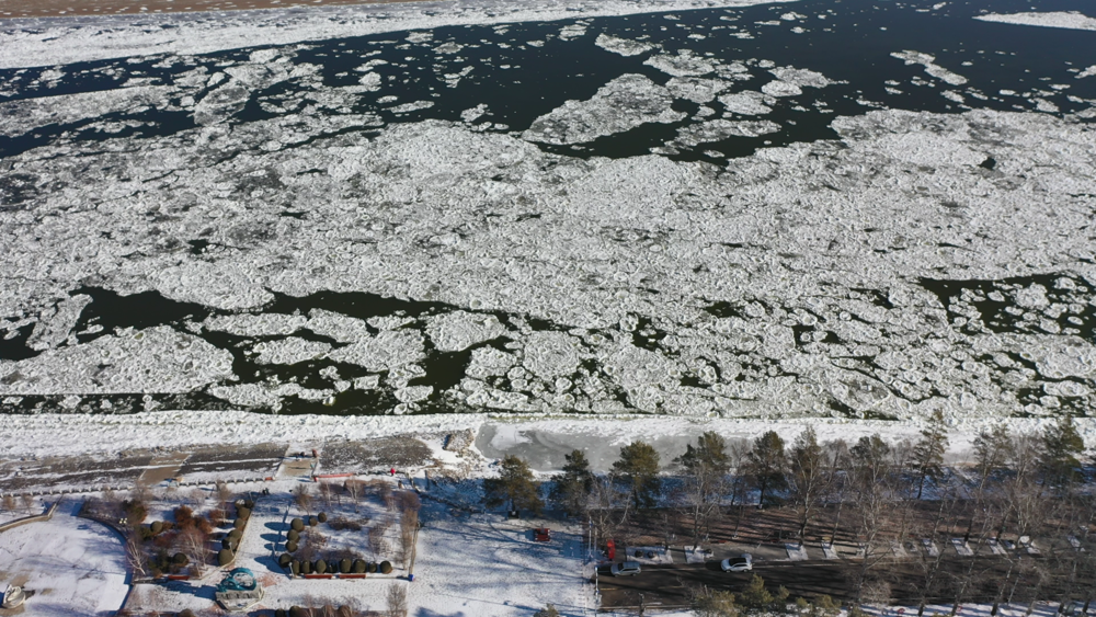 An aerial photo shows the Heilong River as temperatures drop on the Sino-Russia border in Huma county in the Daxinganling region of Heilongjiang province. [Photo by Zhou Yan/For chinadaily.com.cn]