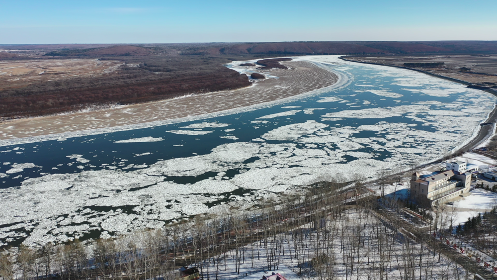 An aerial photo shows the Heilong River as temperatures drop on the Sino-Russia border in Huma county in the Daxinganling region of Heilongjiang province. [Photo by Zhou Yan/For chinadaily.com.cn]