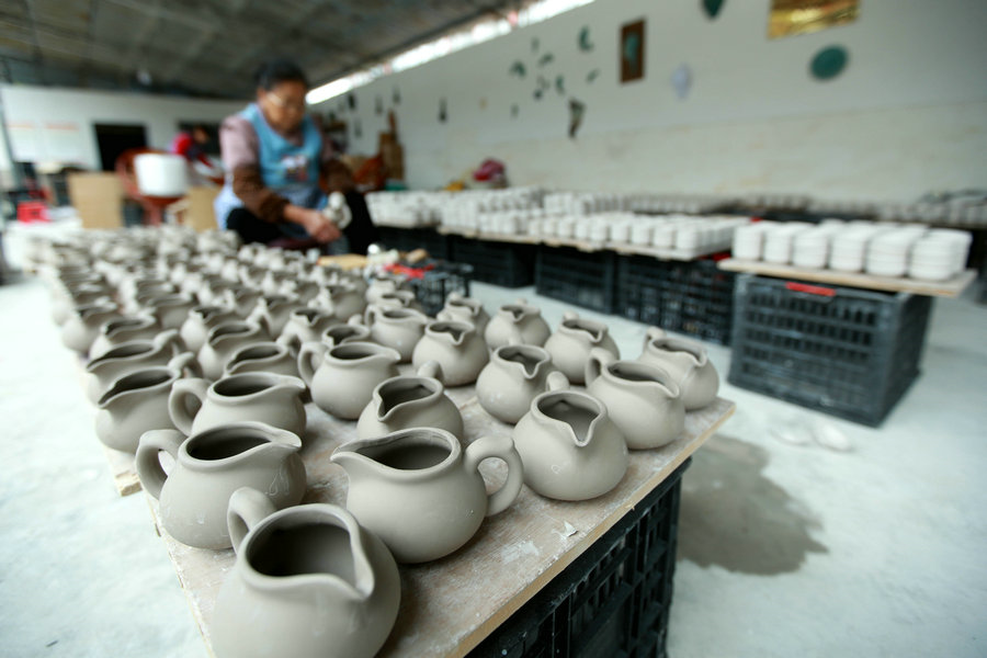 Workers make Yazhou pottery items in a workshop in Yazhou town in Pingtang county, Guizhou province. [Photo by Xiao Wei/For chinadaily.com.cn]