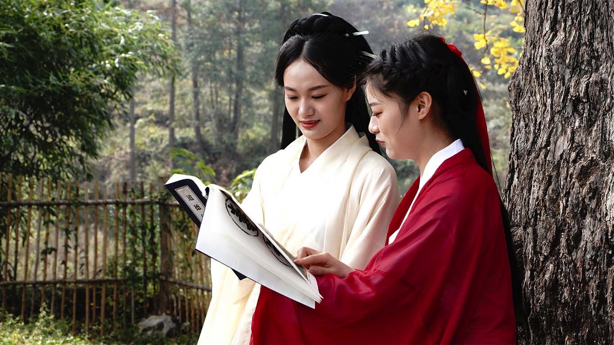 Two women read books at the foot of the Wudang Mountains in Hubei province. [Photo provided to chinaservicesinfo.com]