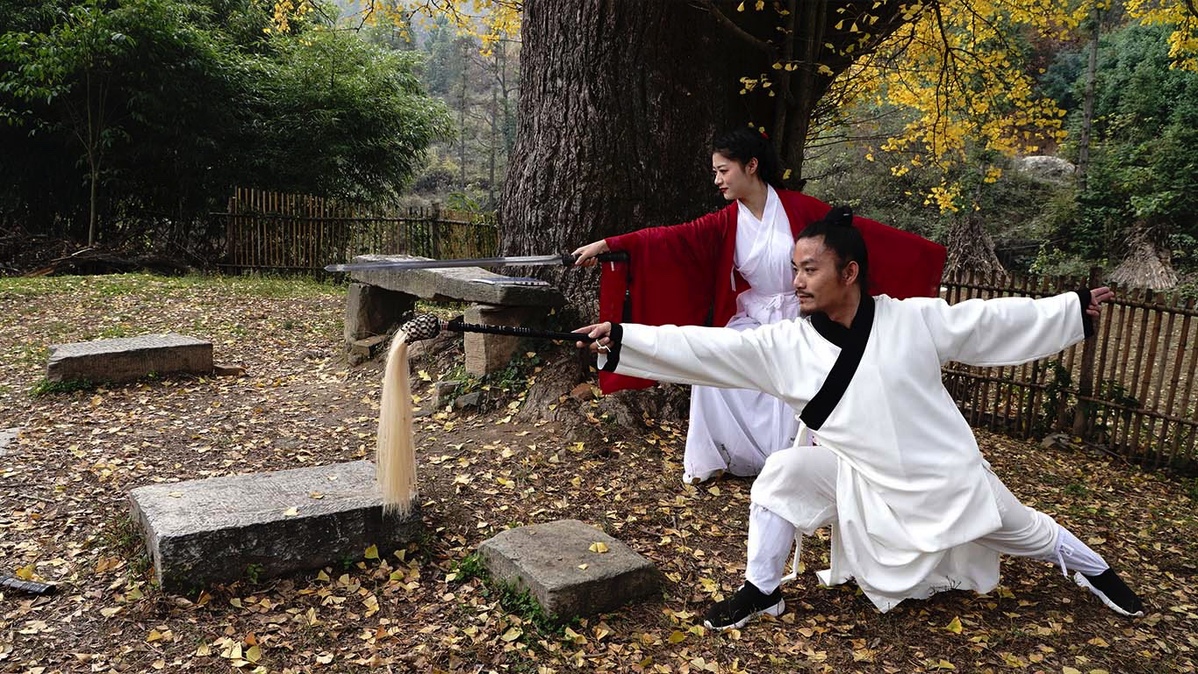 Tourists perform sword dance at the foot of the Wudang Mountains in Hubei province. [Photo provided to chinaservicesinfo.com]