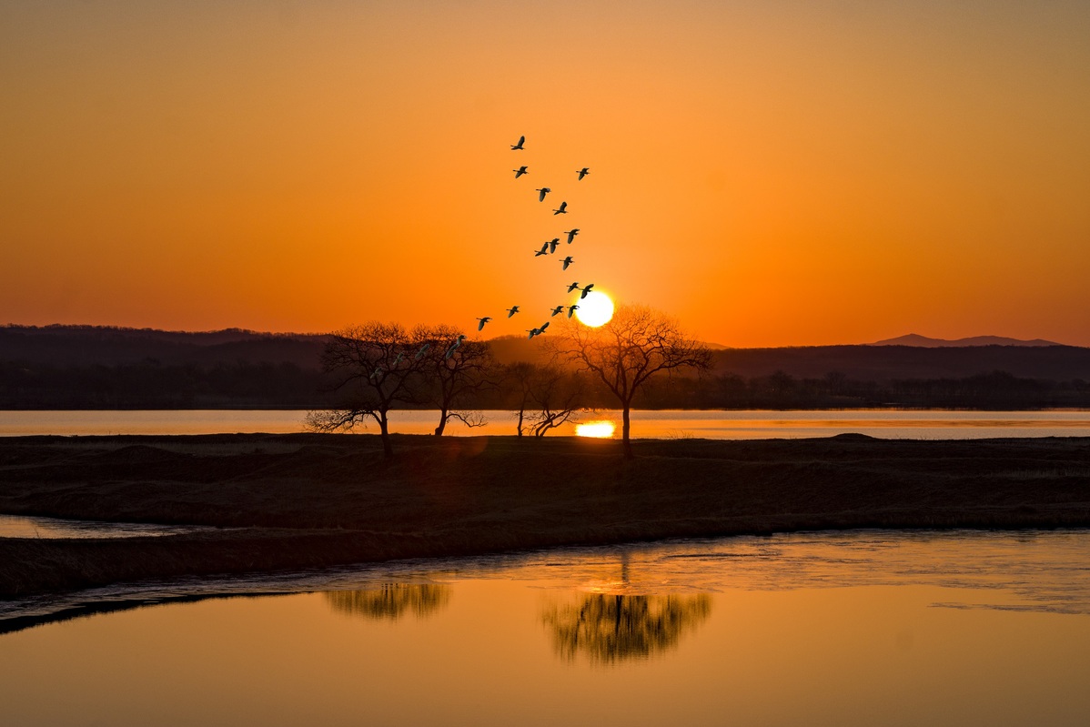 A photo shows a flock of egrets flying at dusk in the Jingxin wetland in Hunchun, Yanbian Korean autonomous prefecture in Jilin province. [Photo by Liu Bailing/For chinadaily.com.cn]