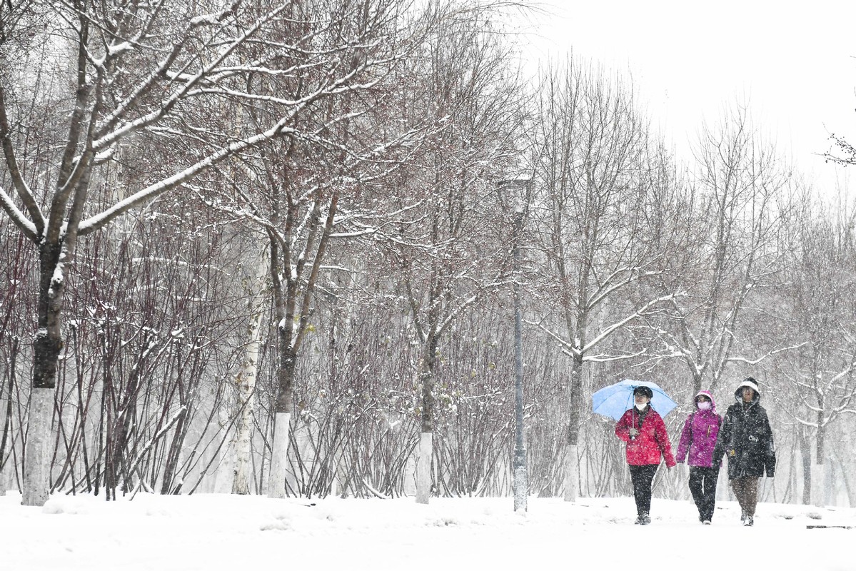 People walk during a snowfall in Changchun, Northeast China's Jilin province, Nov 12, 2022. A snowfall hit some parts of Jilin province on Saturday. [Photo/Xinhua]
