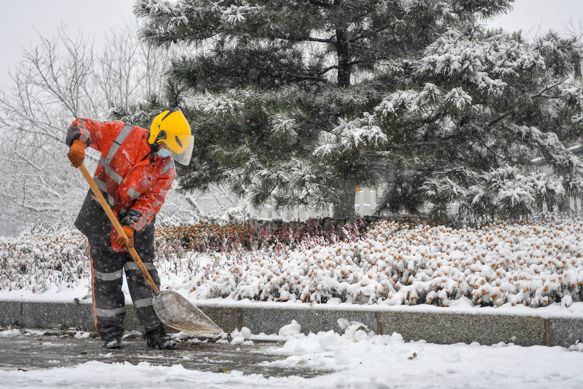 A sanitation worker removes snow by the road in Changchun, Northeast China's Jilin province, Nov 12, 2022. A snowfall hit some parts of Jilin province on Saturday. [Photo/Xinhua]