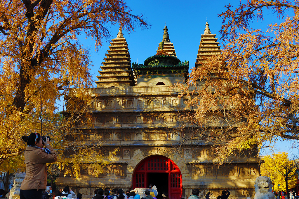 Built in 1473, the Five Pagoda Temple (Wuta Temple) in Beijing is the oldest and most beautiful Vajrasana Pagoda (diamond throne pagoda) in China. In early winter, it is shrouded in golden ginkgo leaves, a scenery photographers love to capture.