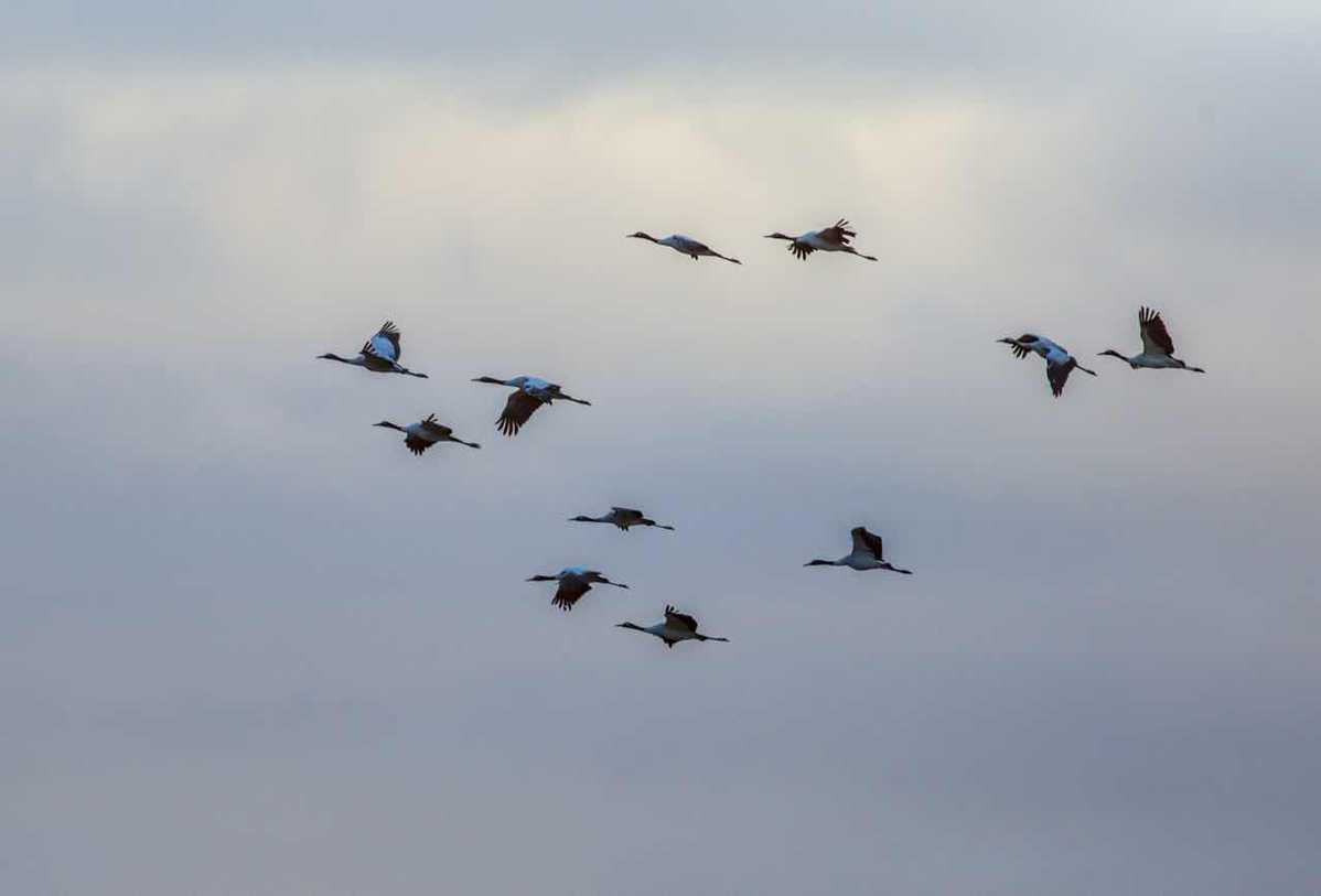 A photo shows a flock of black-necked cranes flying in Nyingchi, Tibet autonomous region. [Photo by Luan Yuanchun/Provided to chinadaily.com.cn]
