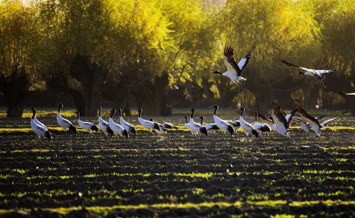 A flock of black-necked cranes forage for food in Nyingchi, Tibet autonomous region. [Photo by Luan Yuanchun/Provided to chinadaily.com.cn]
