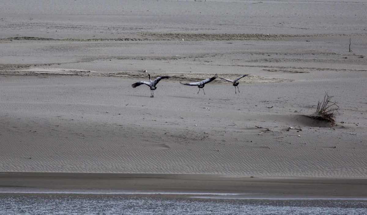 Three black-necked cranes spread their wings on a beach in Nyingchi, Tibet autonomous region. [Photo by Luan Yuanchun/Provided to chinadaily.com.cn]