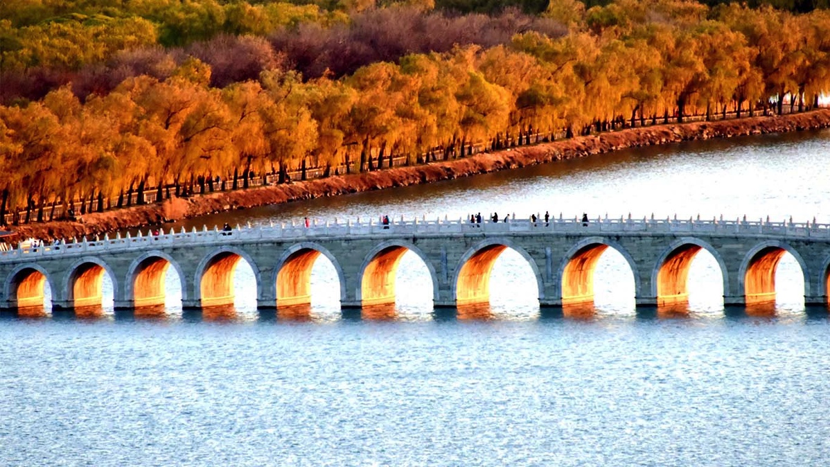 The setting sun shines through the Seventeen-Arch Bridge over Kunming Lake in the Summer Palace in Beijing. [Photo/IC]
